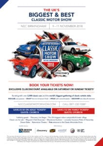 Discounted tickets are now available for GCCG Members for the Lancaster Insurance Classic Motor Show, with Discovery. Taking place at Birmingham’s NEC from Friday 9 – Sunday 11 November 2018